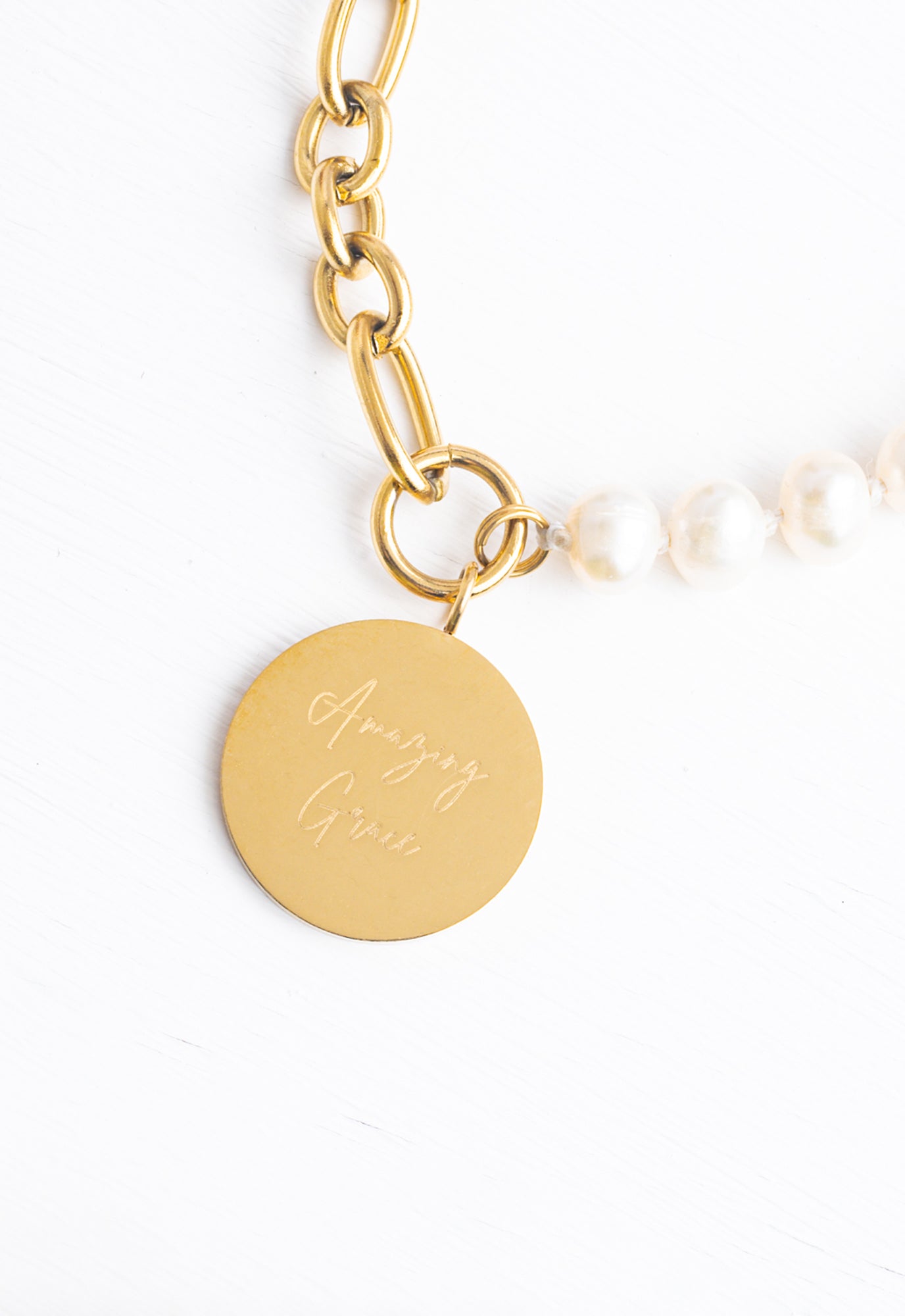 Our new Amazing Grace Necklace is a beautiful symbol of hope. Crafted in freshwater pearls and 14K plated gold, this unique design is sure to be an attention grabber! The combined elements create a beautiful contrast and balance as they hold the engraved pendant featuring the phrase “Amazing Grace.” This stunning symbol of hope and love is a perfect gift for a loved one or a special treat for yourself. Let the Amazing Grace Necklace be a reminder of the hope you share with the women experiencing freedom, establishing independence and developing careers at Starfish Project because of your purchase!