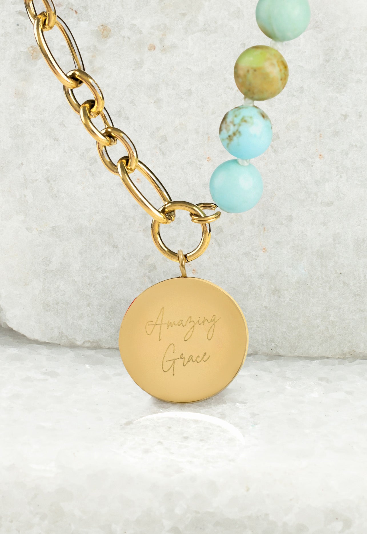 Our new Amazing Grace Necklace is a beautiful symbol of hope. Crafted in serene turquoise and 14K plated gold, this unique design is sure to be an attention grabber! The combined elements create a beautiful contrast and balance as they hold the engraved pendant featuring the phrase “Amazing Grace.” This stunning symbol of hope and love is a perfect gift for a loved one or a special treat for yourself. Let the Amazing Grace Necklace be a reminder of the hope you share with the women experiencing freedom, establishing independence and developing careers at Starfish Project because of your purchase!