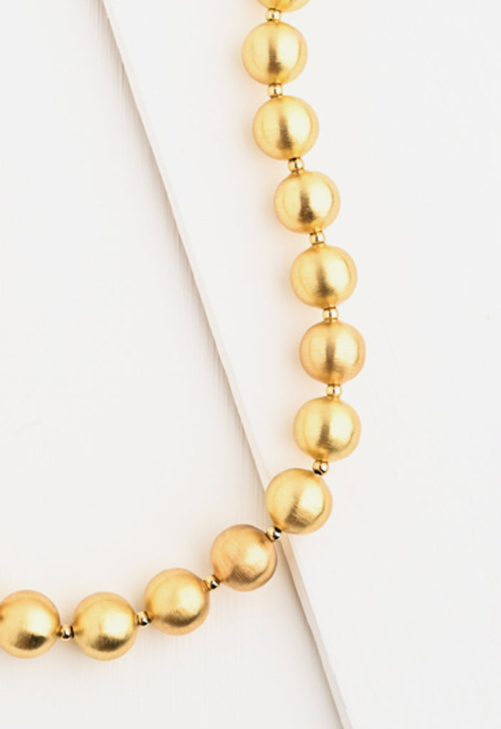 Meet the new timeless statement necklace! Our En Vogue Ball Necklace in18K plated gold will dress up even the simplest look with classic brushed gold spheres. Fall in love with this beautiful accessory, ideal for dressing up your day-to-day or special occasion look. Style with the circle toggle closure in front or back for a versatile day-to-night look. With each En Vogue Ball Necklace purchase, to gift or to wear, you help create safe and dignified work for women experiencing freedom at Starfish Project so they, too, can shine! Make a perfectly paired set with the En Vogue Ball Bracelet in Gold.
