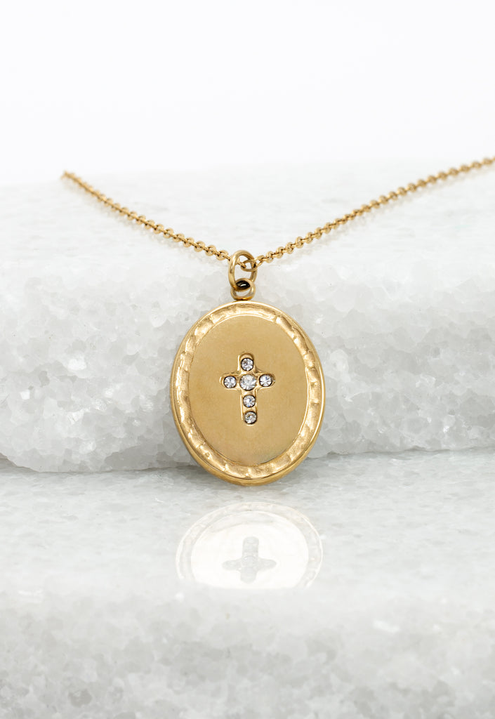 Shine Bright Cross Pendant is a show stopping piece perfect for styling and gifting alike! This shining 14K gold plated reversible pendant features a cross set in irridecent mint resin on one side and a shimmering zircon cross set in gold on the reverse. This outfit centerpiece floats along an adjustable 14K gold plated chain making it perfect for layering and daily wear alike. When you purchase the Shine Bright Necklace to gift or to keep, you help survivors shine as they develop life-transforming lives of freedom. Thank you!