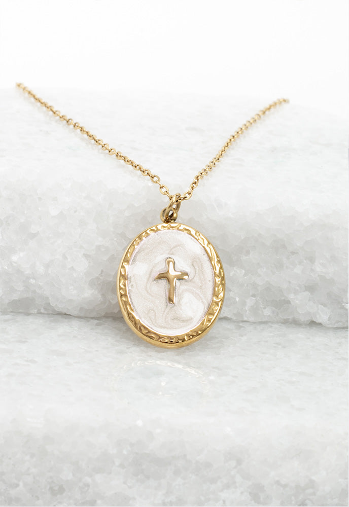 Shine Bright Cross Pendant is a show stopping piece perfect for styling and gifting alike! This shining 14K gold plated reversible pendant features a cross set in ivory resin on one side and a shimmering zircon cross set in gold on the reverse. This outfit centerpiece floats along an adjustable 14K gold plated chain making it perfect for layering and daily wear alike. When you purchase the Shine Bright Necklace to gift or to keep, you help survivors shine as they develop life-transforming lives of freedom. Thank you!