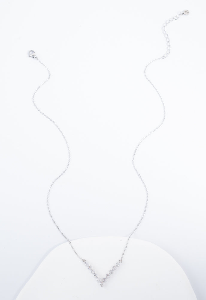 Embody elegance with our Brilliance V-Bar Chevron Necklace, a dazzling fusion of platinum gold and shimmering zircon stones in a delicate chevron setting. It exudes sophistication and style! Wear it solo for a touch of understated glamour, or layer with other pieces for a personalized look. Elevate any formal look from your big day to a night out with its radiant sparkle and timeless charm.