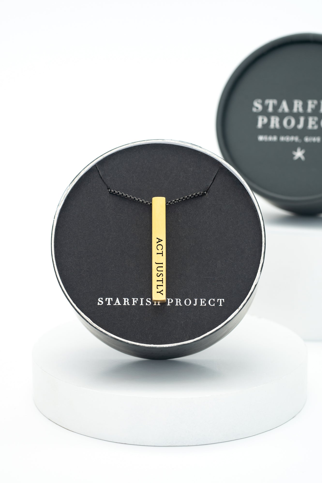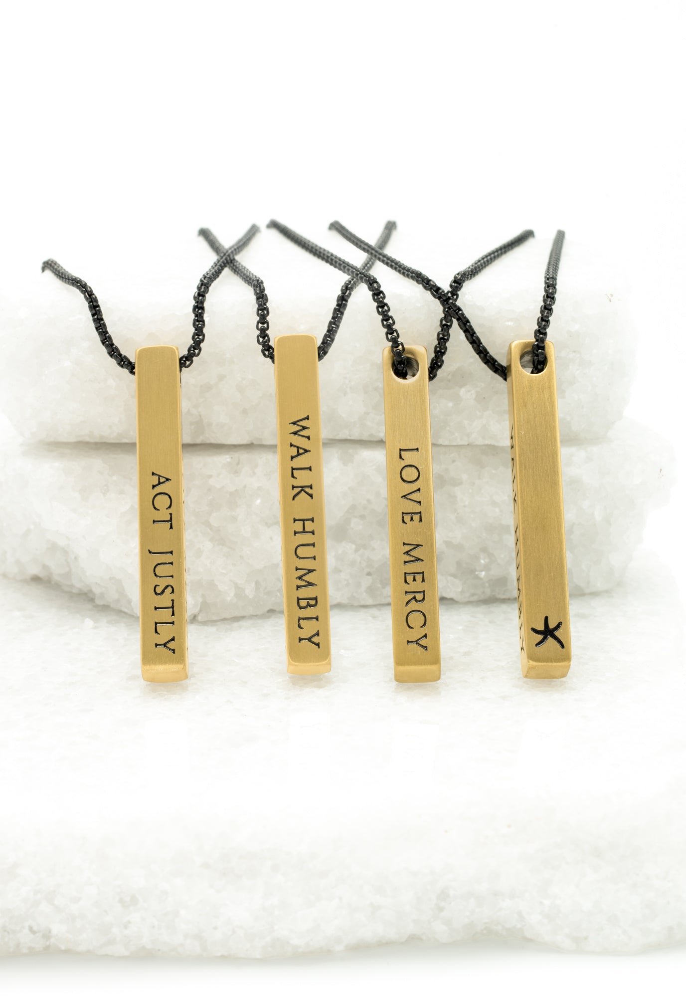 The Justice Necklace is an everyday piece with a powerful message! Each vertical bar is engraved with Act Justly, Love Mercy, Walk Humbly, and our classic Starfish Project emblem. This timeless stainless steel bar is hung from a matching silver stainless steel chain. As we Act Justly, Love Mercy and Walk Humbly we can restore hope to a broken world.