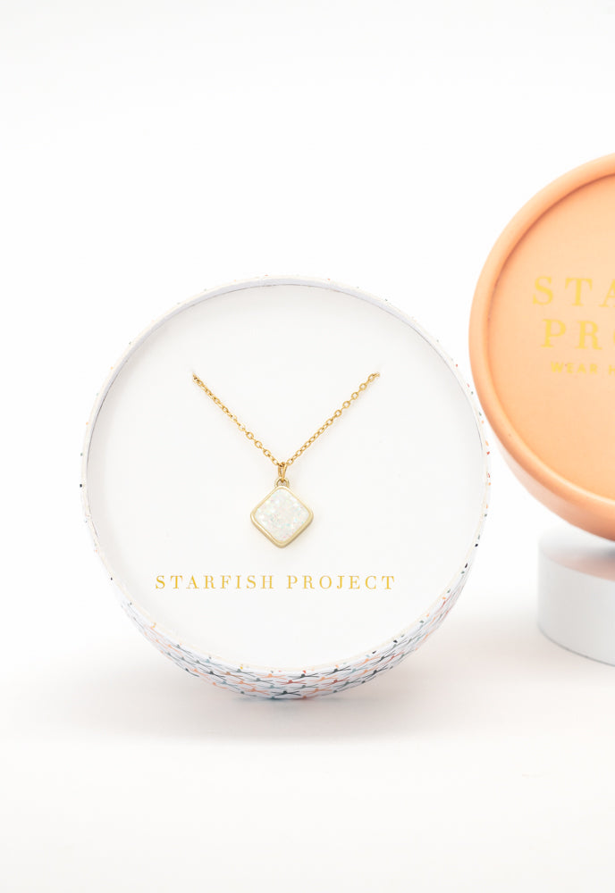 The Clare Pendant is simply stunning. The ivory opal stone is the picture of modern sophistication as it glisten and glows in the light. This adjustable 14k gold plated pendant is a collection must-have! With each purchase of the Clare Opal Necklace, you help the women of Starfish Project shine!