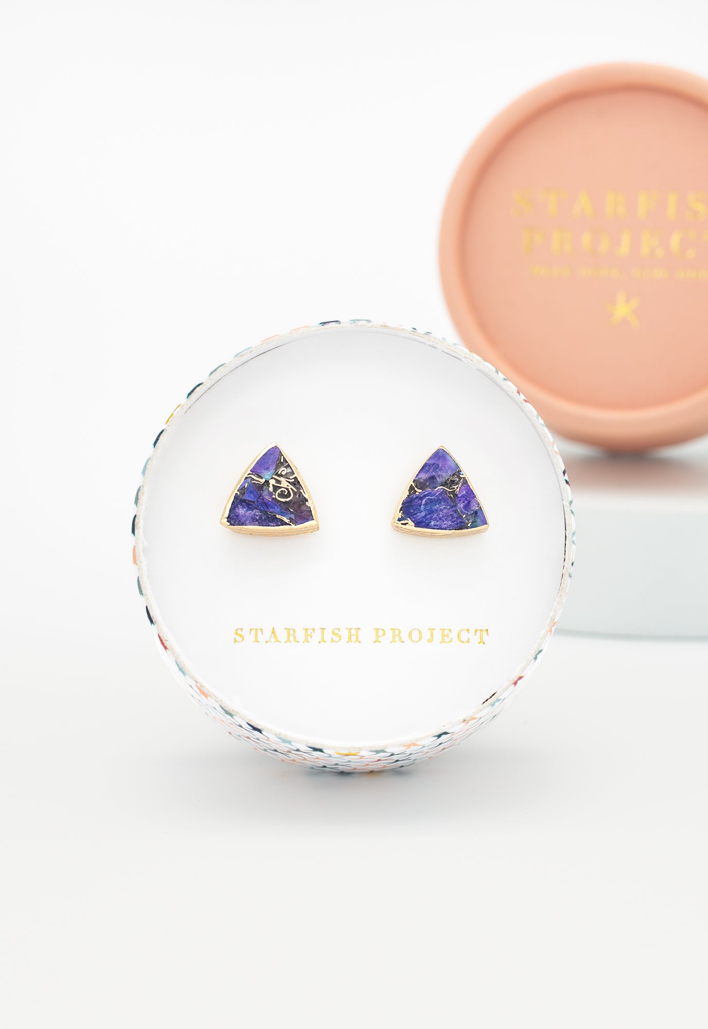 The Haven Studs are a reminder—and a catalyst—of safety, rest, and hope. Rich royal purple emperor stone is woven with shimmering 14k gold for a striking, radiant finish in a softly rounded triangle shape. Bold yet balanced, these earrings bring warmth and beauty to everyday moments. Each purchase helps provide safe housing and dignified employment for women and girls escaping exploitation—creating real places of refuge where healing and new beginnings can flourish.